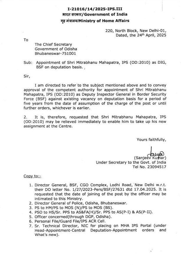କେନ୍ଦ୍ରକୁ ଡେପୁଟେଶନରେ ଯିବେ ଆଉ ୨ ବରିଷ୍ଠ ଆଇପିଏସ୍ ଅଫିସର। ବିଏସ୍ଏଫ୍ ଆଇଜି ଭାବେ ଆଇପିଏସ୍ ରବିକାନ୍ତ ଡେପୁଟେଶନରେ ଯିବେ। ସେହିଭଳି ଆଇପିଏସ୍ ଅଫିସର ମିତ୍ରଭାନୁ ମହାପାତ୍ର ୫ ବର୍ଷ ଲାଗି ବିଏସ୍ଏଫ୍ ଡିଆଇଜି ଭାବେ ନିଯୁକ୍ତ ହେବେ। ଏନେଇ ଗୃହ ମନ୍ତ୍ରଣାଳୟ ପକ୍ଷରୁ ବିଧିବଦ୍ଧ ଭାବେ ନୋଟିସ ଜାରି ହୋଇଛି।