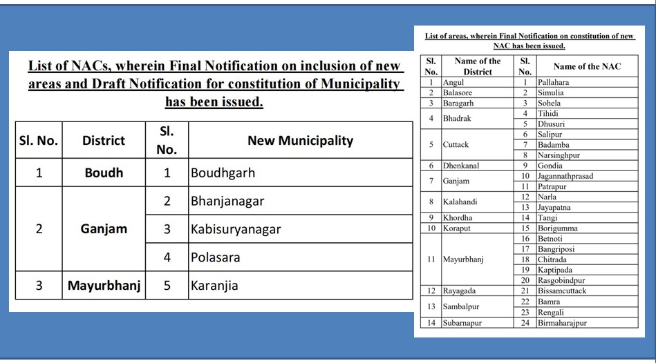 ବିଜ୍ଞପ୍ତି ଅନୁସାରେ, ନୂଆ ଏନଏସିଗୁଡ଼ିକ ହେଉଛି ପାଲଲହଡ଼ା, ସିମୁଳିଆ, ସୋହେଲା, ତିହିଡି, ଧୂଷୁରୀ, ସାଲେପୁର, ବଡ଼ମ୍ବା, ନରସିଂହପୁର, ଗଁଦିଆ, ଜଗନ୍ନାଥପ୍ରସାଦ, ପାତ୍ରପୁର, ନର୍ଲା, ଜୟପାଟଣା, ଖୋର୍ଦ୍ଧାର ଟାଙ୍ଗୀ, ବୋରିଗୁମ୍ମା, ବେତନଟୀ, ବାଙ୍ଗିରିପୋଷି, ଚିତ୍ରଡ଼ା, କପ୍ତିପଦା, ରାସଗୋବିନ୍ଦପୁର, ବିଷମକଟକ, ବାମରା, ରେଙ୍ଗାଲି ଏବଂ ବୀରମହାରାଜପୁର। ସେହିପରି ନୂଆ ପୌର ପରିଷଦଗୁଡ଼ିକ ହେଉଛି ବୌଦ୍ଧ ଜିଲାର ବୌଦ୍ଧଗଡ଼ ଓ ଭଞ୍ଜନଗର, ଗଞ୍ଜାମ ଜିଲାର କବିସୂର୍ଯ୍ୟନଗର ଓ ପୋଲସରା ଏବଂ ମୟୂରଭଞ୍ଜ ଜିଲାର କରଞ୍ଜିଆ।