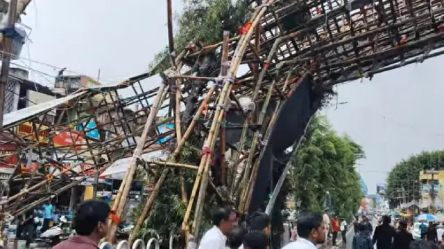 ବର୍ଷା ଯୋଗୁ କଟକରେ ଭାଙ୍ଗିଲା ତୋରଣ। କଲେଜ ଛକ ପୂଜା କମିଟିର ଲାଇଟ ଗେଟ ଓ ରାଜବଗିଚା ସର୍ବୋଦୟପୁର ପୂଜା କମିଟି ଛାତର ପାରାପିଟ୍ସ ଭାଙ୍ଗି ଯାଇଛି। ଘଟଣାସ୍ଥଳରେ ଯାନବାହାନ ଯାତାୟାତ ଠପ ହୋଇଥିବା ସୂଚନା ମିଳିଛି। ମିଳିଥିବା ସୂଚନାଅନୁଯାୟୀ, ଦୁର୍ଗା ପୂଜା ମହାନବମୀ ଅବସରରେ ମୁଖ୍ୟମନ୍ତ୍ରୀ ମୋହନ ଚରଣ ମାଝୀ କଟକ ଗସ୍ତ କରି ୩୧ଟି ପୂଜା ମଣ୍ଡପ ବୁଲିବାର କାର୍ଯ୍ୟକ୍ରମ ରହିଥିଲା। ମଧ୍ୟାହ୍ନ ସମୟରେ ପ୍ରାୟ ଅଧଘଣ୍ଟା ଧରି ବର୍ଷା ହେବାରୁ ପ୍ରଥମେ କଲେଜ ଛକ ପୂଜା କମିଟି ନିକଟରେ ଥିବା ଗୋଟିଏ ଲାଇଟ ଗେଟ ଭାଙ୍ଗି ଯାଇଥିଲା। ଏହାସହ ବର୍ଷା ଯୋଗୁ ରାଜବାଗିଚା ସର୍ବୋଦୟପୁର ପୂଜା କମିଟିର ପାରାପିଟ୍ସରେ ପାଣି ଜମିବାରୁ ପାରାପିଟ୍ସଟି ଭାଙ୍ଗି ଯାଇଥିଲା। ତେବେ କଟକରେ ଦୁର୍ଗା ପୂଜା ସମୟରେ ଏଭଳି ଘଟଣା ଘଟିବା ଚିନ୍ତାର ବିଷୟ ପାଲଟିଛି।