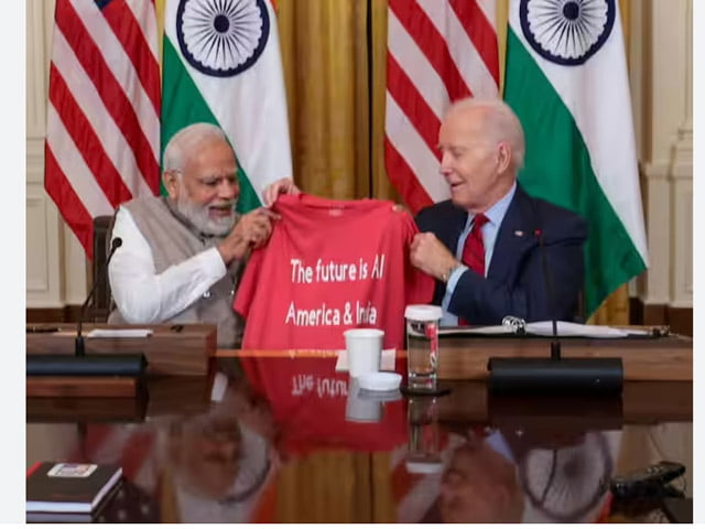 ୩ ଦିନିଆ ଆମେରିକା ଗସ୍ତ ସାରି ପ୍ରଧାନମନ୍ତ୍ରୀ ନରେନ୍ଦ୍ର ମୋଦି ଇଜିପ୍ଟରେ ପହଂଚିଛନ୍ତି। ତେବେ ଆମେରିକା ଗସ୍ତ ଅବସରରେ ରାଷ୍ଟ୍ରପତି ବାଇଡେନ ମୋଦିଙ୍କୁ ଏକ ଖାସ୍ ଉପହାର ପ୍ରଦାନ କରିଛନ୍ତି। ରାଷ୍ଟ୍ରପତି ଜୋ’ ବାଇଡେନ ଗତକାଲି ମୋଦିଙ୍କୁ AI ଲେଖାଥିବା ଏକ ଟି- ସାର୍ଟ ଉପହାର ଦେଇଛନ୍ତି। ଆମେରିକା କଂଗ୍ରେସକୁ ସମ୍ବୋଧନ ବେଳେ ମୋଦି AI ଶବ୍ଦ ଉଚ୍ଚାରଣ କରିଥିଲେ। ଏହା ଆମେରିକା ଓ ଭାରତର ଦୃଢ଼ ସମ୍ବନ୍ଧକୁ ସୂଚାଉଥିବା କହିଥିଲେ। ଗତ ୭ ବର୍ଷ ମଧ୍ୟରେ ବହୁ କିଛି ପରିବର୍ତ୍ତନ ଘଟିଛି। ଆମେରିକା ଓ ଭାରତର ବନ୍ଧୁତା ପୂର୍ବ ପରି ଅତୁଟ ରହିଛି। ଏବେ AI ଅର୍ଥାତ ଆର୍ଟିଫିସିଆଲ ଇଣ୍ଟେଲଜେନ୍ସି ଯୁଗରେ ଆମେରିକା ଭାରତର ସମ୍ବନ୍ଧ ବି ଖୁବ୍ ଦୃଢ ହେବାରେ ଲାଗିଛି। ଏହାପରେ ଉଭୟ ନେତାଙ୍କ ମଧ୍ୟରେ ଆଲୋଚନା ସମୟରେ ବାଇଡେନ ମୋଦିଙ୍କୁ ଉକ୍ତ ଟି-ସାର୍ଟ ଉପହାର ଦେଇଥିଲେ। ଏହି ଗସ୍ତ ଅବସରରେ ମୋଦି ଆମେରିକା ରାଷ୍ଟ୍ରପତି ଜୋ’ ବାଇଡେନଙ୍କ ସହ ଦ୍ୱିପାକ୍ଷିକ ଆଲୋଚନା କରିଥିବେ ବେଳେ ୟୁଏସ୍ କଂଗ୍ରେସକୁ ସମ୍ବୋଧନ କରିଥିଲେ।