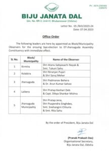 ଆସନ୍ତା ମାସ ୧୦ ତାରିଖରେ ଝାରସୁଗୁଡ଼ା ବିଧାନସଭା ଆସନ ପାଇଁ ଉପନିର୍ବାଚନ ଅନୁଷ୍ଠିତ ହେବ । ତା’ପରେ ୧୩ ତାରିଖରେ ଭୋଟ ଫଳାଫଳ ପ୍ରକାଶ ପାଇବ । ତେବେ ଏହି ନିର୍ବାଚନ ପାଇଁ ରାଜ୍ୟର ତିନି ପ୍ରମୁଖ ରାଜନୈତିକ ଦଳ ବିଜେଡି, ବିଜେପି ଓ କଂଗ୍ରେସ ପ୍ରୟାସ ଆରମ୍ଭ କରିଦେଇଛନ୍ତି । ଶାସକ ବିଜେଡି ଝାରସୁଗୁଡ଼ା ଲଢ଼େଇ ପାଇଁ ନିଜର ଟିମ୍ ଗଠନ କରିଛି । ଏହି ନିର୍ବାଚନ ମଣ୍ଡଳୀର ୫ଟି ବ୍ଲକ / ମ୍ୟୁନିସିପାଲିଟି ପାଇଁ ଦଳ ୧୨ ଜଣ ପର୍ଯ୍ୟବେକ୍ଷକଙ୍କୁ ଦାୟିତ୍ୱ ଦେଇଛି । କିରମିରା, କୋଲାବିରା, ଝାରସୁଗୁଡ଼ା, ଲାଇକେରା ବ୍ଲକ ଓ ଝାରସୁଗୁଡ଼ା ମ୍ୟୁନିସିପାଲିଟି ପାଇଁ ଦଳ ଏହି ସମସ୍ତ ନେତାଙ୍କ ନାମ ଘୋଷଣା କରିଛି । ଏ ନେଇ ଦଳ ତରଫରୁ ଏକ ନୋଟିସ୍ ଜାରି କରାଯାଇଛି ।