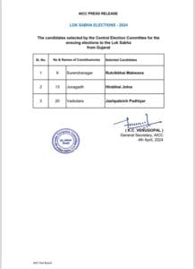 ଲୋକସଭା ନିର୍ବାଚନ ୨୦୨୪ ପାଇଁ କଂଗ୍ରେସ ୧୩ତମ ପ୍ରାର୍ଥୀ ତାଲିକା ଜାରି କରିଛି। ପ୍ରକାଶିତ ତାଲିକାରେ ଆଉ ୩ ଜଣ ପ୍ରାର୍ଥୀଙ୍କ ନାମ ଘୋଷଣା କରାଯାଇଛି। ଗୁଜୁରାଟର ୩ଟି ଲୋକସଭା ନିର୍ବାଚନ ମଣ୍ଡଳୀ ସୁରେନ୍ଦ୍ରନଗର, ଜୁନାଗଡ଼ ଓ ଭଦୋଦରା ପାଇଁ ଦଳ ପ୍ରାର୍ଥୀମାନଙ୍କ ନାମ ଘୋଷଣା କରିଛି । ସୁରେନ୍ଦ୍ରନଗରରୁ ରିତ୍ବିକ ଭାଇ ମକୱାନା, ଜୁନାଗଡ଼ରୁ ହୀରା ଭାଇ ଜୋତୱା ଓ ଭଦୋଦରାରୁ ଜସପାଲ ସିଂ ପୋଧିଆରଙ୍କୁ ଦଳ ଟିକେଟ୍ ଦେଇଛି। କଂଗ୍ରେସ ଏପର୍ଯ୍ୟନ୍ତ ୨୩୫ ଜଣ ପ୍ରାର୍ଥୀଙ୍କ ପାଇଁ ପ୍ରାର୍ଥୀ ଘୋଷଣା କରିଛି। ଦଳ ପୂର୍ବରୁ ୧୨ଟି ଭିନ୍ନ ଭିନ୍ନ ତାଲିକାରେ ୨୩୨ ଜଣ ପ୍ରାର୍ଥୀ ଘୋଷଣା କରିଥିବା ବେଳେ ଏପର୍ଯ୍ୟନ୍ତ ଉତ୍ତରପ୍ରଦେଶର ଆମେଥି ଓ ରାୟବରେଲି ପାଇଁ ପ୍ରାର୍ଥୀ ଘୋଷଣା କରିନାହିଁ । ଏହି ଦୁଇ ଆସନରୁ ରାହୁଲ ଗାନ୍ଧି ଓ ପ୍ରିୟଙ୍କା ଗାନ୍ଧି ଲଢିବା ନେଇ ଚର୍ଚ୍ଚା ହେଉଛି ।
