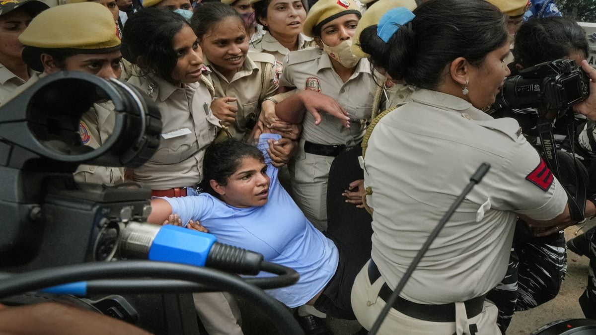 New Delhi: Security personnel detain wrestler Sakshi Malik during wrestlers' protest march towards new Parliament building, in New Delhi, Sunday, May 28, 2023. (PTI Photo/Kamal Singh)(PTI05_28_2023_000157A)