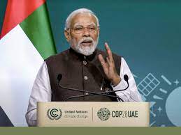 ୨୦୨୮ରେ ଭାରତରେ ଜାତିସଂଘ ଜଳବାୟୁ ସମ୍ମିଳନୀ ଆୟୋଜନ କରିବା ପାଇଁ ପ୍ରଧାନମନ୍ତ୍ରୀ ନରେନ୍ଦ୍ର ମୋଦୀ ଦୁବାଇରେ ଅନୁଷ୍ଠିତ ସିଓପି୨୮ ସମ୍ମିଳନୀରେ ପ୍ରସ୍ତାବ ରଖିଛନ୍ତି। ଏହି ଅବସରରେ ପ୍ରଧାନମନ୍ତ୍ରୀ ପରିବେଶର ସୁରକ୍ଷା ପାଇଁ ଭାରତ ପକ୍ଷରୁ ଗ୍ରହଣ କରାଯାଇଥିବା ପଦକ୍ଷେପଗୁଡ଼ିକ ସଂପର୍କରେ ଆଲୋକପାତ କରିଥିଲେ। ପ୍ରଧାନମନ୍ତ୍ରୀ କହିଛନ୍ତି ଯେ ଭାରତ ସର୍ବଦା ଆର୍ଥିକ ବିକାଶ ସହିତ ପରିବେଶ ସନ୍ତୁଳନକୁ ପ୍ରାଥମିକତା ଦେଇଆସିଛି। ଆଜି ଭାରତ ବିଶ୍ବ ସମ୍ମୁଖରେ ବିକାଶ ଓ ପରିବେଶଗତ ସନ୍ତୁଳନର ଶ୍ରେଷ୍ଠ ଉଦାହରଣ ରଖିଛି। ଭାରତର ଜନସଂଖ୍ୟା ବିଶ୍ବର ଜନସଂଖ୍ୟାର ୧୭ ପ୍ରତିଶତ ହୋଇଥିବା ସତ୍ତ୍ବେ ଏହାର ଅଙ୍ଗାର ନିର୍ଗମନ ମାତ୍ର ୪ ପ୍ରତିଶତ ରହିଛି। ଏହା ସହିତ ପରିବେଶର ସୁରକ୍ଷା ପାଇଁ ଭାରତ ଲଗାତାର କାମ କରିଆସୁଛି। ଜଳବାୟୁ ନ୍ୟାୟ, ଜଳବାୟୁ ଅର୍ଥନୀତି ଏବଂ ଗ୍ରୀନ୍ କ୍ରେଡିଟ୍ ଉପରେ ଭାରତ ସର୍ବଦା ଗୁରୁତ୍ବାରୋପ କରିଆସିଛି। ବିଶ୍ବ କଲ୍ୟାଣ ପାଇଁ ସବୁ ରାଷ୍ଟ୍ର ମିଳିତ ଭାବେ କାମ କରିବା ଜରୁରୀ ବୋଲି ପ୍ରଧାନମନ୍ତ୍ରୀ କହିଛନ୍ତି। ଭାରତ ଜାତିସଂଘର ରଣନୀତି ଆଧାରରେ କାମ କରିବା ପାଇଁ ତତ୍ପର ରହିଛି ଏବଂ ୨୦୨୮ରେ ସିଓପି-୩୩ ସମ୍ମିଳନୀ ଭାରତରେ କରାଯାଉ ବୋଲି ପ୍ରଧାନମନ୍ତ୍ରୀ ପ୍ରସ୍ତାବ ରଖିଛନ୍ତି। ପ୍ରଧାନମନ୍ତ୍ରୀ କହିଛନ୍ତି, ଭାରତ ଅଙ୍ଗାର ପ୍ରଦୂଷଣକୁ ୪୫ ପ୍ରତିଶତ କମ୍ କରିବା ପାଇଁ ଲକ୍ଷ୍ୟ ରଖିଛି ଏବଂ ଏହି ଲକ୍ଷ୍ୟ ୨୦୩୦ ସୁଦ୍ଧା ହାସଲ କରିବାକୁ ଆମେ ପ୍ରୟାସ ଜାରି ରଖିଛୁ। ଭାରତରେ ଏବେ ଜୀବାଶ୍ମ ଇନ୍ଧନର ବ୍ୟବହାର ୫୦ ପ୍ରତିଶତ ରଖାଯିବାକୁ ନିଷ୍ପତ୍ତି ନିଆଯାଇଛି ଏବଂ ୨୦୭୦ ସୁଦ୍ଧା ଏହାକୁ ଶୂନରେ ପହଞ୍ଚାଇବାକୁ ଲକ୍ଷ୍ୟ ରହିଛି ବୋଲି ପ୍ରଧାନମନ୍ତ୍ରୀ କହିଛନ୍ତି।