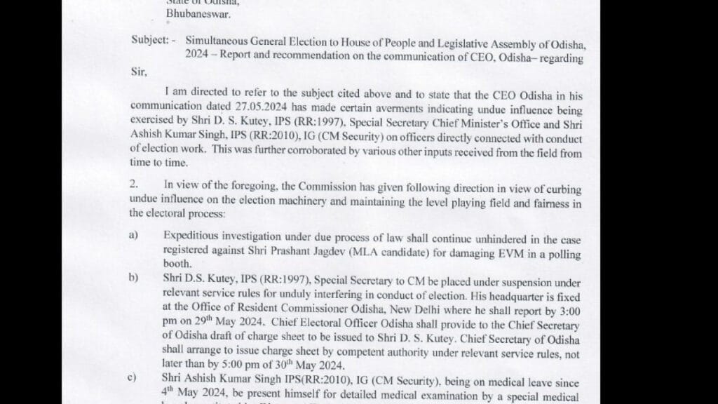 ସେହିପରି ୨୦୧୦ ବ୍ୟାଚ୍ ଆଇପିଏସ୍ ଆଶିଷ କୁମାର ସିଂଙ୍କ ସ୍ୱାସ୍ଥ୍ୟ ଖରାପର ଯାଂଚ ଭୁବନେଶ୍ୱର ଏମସ୍ ଡାକ୍ତର ବୋର୍ଡ କରିବାକୁ ଆଜି ନିର୍ବାଚନ କମିଶନ ନିର୍ଦ୍ଦେଶ ଦେଇଛନ୍ତି । ରାଜ୍ୟ ମୁଖ୍ୟ ନିର୍ବାଚନ ଅଧିକାରୀଙ୍କ ସୁପାରିଶ ଓ ରିପୋର୍ଟ ଆଧାରରେ ନିର୍ବାଚନ କମିଶନ ଆଇପିଏସ୍ ଅଫିସର ଡିଏସ କୁଟ୍ଟେ ଓ ଆଶିଷ ସିଂଙ୍କ ଉପରେ କଡ଼ା କାର୍ଯ୍ୟାନୁଷ୍ଠାନ ଗ୍ରହଣ କରିଛନ୍ତି । ଏହି ଦୁଇ ଆଇପିଏସ୍ ଅଫିସର ନିର୍ବାଚନୀ ଗତିବିଧିରେ ସମ୍ପୃକ୍ତ ଥିବାର ସିଧାସଳଖ ପ୍ରମାଣ ବାରମ୍ବାର ମିଳିବା ପରେ ଏଭଳି କାର୍ଯ୍ୟାନୁଷ୍ଠାନ ଗ୍ରହଣ କରାଯାଇଛି । ମୁଖ୍ୟମନ୍ତ୍ରୀଙ୍କ ବ୍ୟକ୍ତିଗତ ସଚିବ ଡିଏସ୍ କୁଟ୍ଟେଙ୍କୁ ଚାକିରିରୁ ତତ୍କାଳ ପ୍ରଭାବରୁ ନିଲମ୍ବନ କରାଯିବା ସହ ତାଙ୍କୁ ନୂଆଦିଲ୍ଲୀସ୍ଥିତ ମୁଖ୍ୟ ଆବାସିକ କମିଶନରଙ୍କ କାର୍ଯ୍ୟାଳୟରେ ଆଜି ଅପରାହ୍ନ ୩ଟା ସୁଦ୍ଧା ହାଜର ହେବାକୁ ନିର୍ଦ୍ଦେଶ ଦିଆଯାଇଛି । ଏହାସହିତ ଡିଏସ କୁଟ୍ଟେଙ୍କ ବିରୁଦ୍ଧରେ ଥିବା ଚିଠା ଚାର୍ଜସିଟକୁ ରାଜ୍ୟ ମୁଖ୍ୟ ସଚିବଙ୍କୁ ଦେବା ପାଇଁ ରାଜ୍ୟ ମୁଖ୍ୟ ନିର୍ବାଚନ ଅଧିକାରୀଙ୍କୁ ନିର୍ଦ୍ଦେଶ ଦିଆଯାଇଛି । ଡିଏସ କୁଟ୍ଟେଙ୍କ ବିରୁଦ୍ଧରେ ଚାକିରି ସର୍ତ୍ତାବଳୀ ଅନୁସାରେ ଆବଶ୍ୟକ ଚାର୍ଜସିଟ୍ ମେ’ ୩୦ତାରିଖ ସୁଦ୍ଧା ପ୍ରସ୍ତୁତ କରିବାକୁ ମଧ୍ୟ ମୁଖ୍ୟ ସଚିବଙ୍କୁ ନିର୍ଦ୍ଦେଶ ଜାରି ହୋଇଛି ।