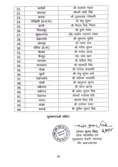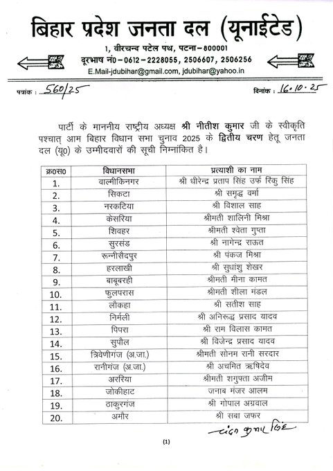 ମୁଖ୍ୟମନ୍ତ୍ରୀ ନୀତିଶ କୁମାରଙ୍କ ଜନତା ଦଳ ୟୁନାଇଟେଡ୍ (ଜେଡିୟୁ) ଆଜି ଆଗାମୀ ବିଧାନସଭା ନିର୍ବାଚନ ପାଇଁ ୪୪ଜଣ ପ୍ରାର୍ଥୀଙ୍କ ଚୂଡ଼ାନ୍ତ ତାଲିକା ପ୍ରକାଶ କରିଛି। ବୁଧବାର ବିହାର ବିଧାନସଭା ନିର୍ବାଚନ ପାଇଁ ଜେଡିୟୁ ପ୍ରଥମ ପର୍ଯ୍ୟାୟ ପ୍ରାର୍ଥୀ ତାଲିକା ଜାରି କରିଥିଲା।