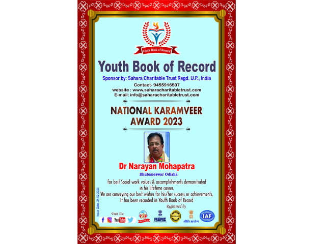ଆନ୍ତର୍ଜାତୀୟ ମାତୃଭାଷା ଦିବସରେ ଶାହା ଚାରିଟେବୁଲ ଟ୍ରଷ୍ଟ ପରିବାର ଉତ୍ତର ପ୍ରଦେଶ ପକ୍ଷରୁ ଡ ନାରାୟଣ ମହାପାତ୍ର ଙ୍କୁ “ଜାତୀୟ କର୍ମବୀର ସମ୍ମାନ ୨୦୨୩ ” ରେ ସମ୍ମାନିତ କରାଯାଇଛି। ଆନ୍ତର୍ଜାତୀୟ ହ୍ୟୁମାନଟେରିଆନ ଅନୁଷ୍ଠାନ ଦି କିଙ୍ଗଡମ ଅଫ ନ୍ୟୁ ଆଟଲାଣ୍ଟିକ ପକ୍ଷରୁ ସମାଜ ସେବା କ୍ଷେତ୍ରରେ ଉଲ୍ଲେଖନୀୟ ଅବଦାନ ନିମନ୍ତେ ଜୟ ମା ଭବାନୀ ଚାରିଟେବୁଲ ଟ୍ରଷ୍ଟର ସମ୍ପାଦକ ଶ୍ରୀ ମହାପାତ୍ର ଙ୍କୁ ହ୍ୟୁମ୍ୟାନଟେରିଆନ ଉପାଧି ପ୍ରଦାନ କରାଯାଇଛି | ଟ୍ରଷ୍ଟ ପକ୍ଷରୁ ସମାଜ ରେ ଅବହେଳିତ ବୃଦ୍ଧ ବାପା ମା ଓ ଅବହେଳିତ ଛୋଟ ପିଲାମାନଙ୍କ ପାଖରେ ପହଞ୍ଚି ମାଗଣା ସ୍ୱାସ୍ଥ୍ୟ ସେବା ନିମନ୍ତେ ଏହି ସମ୍ମାନ ପ୍ରଦାନ କରଯାଇଛି |