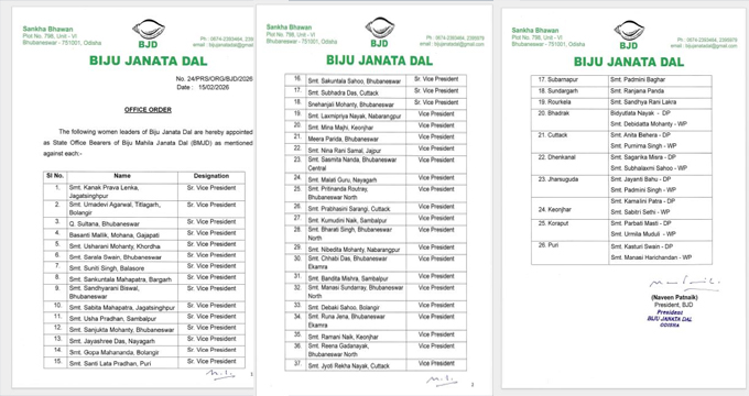 ବିଜୁ ମହିଳା ଜନତା ଦଳ (BMJD) ସାଂଗଠନିକ କର୍ମକର୍ତ୍ତାଙ୍କୁ ଦାୟିତ୍ୱ ବଣ୍ଟନ କରାଯାଇଛି। ଜିଲ୍ଲା ସଭାନେତ୍ରୀ ଓ କାର୍ଯ୍ୟକାରୀ ସଭାନେତ୍ରୀ ଭାବେ ଦାୟିତ୍ୱ ବଣ୍ଟନ କରିଛନ୍ତି ବିଜେଡି ସୁପ୍ରିମୋ ନବୀନ ପଟ୍ଟନାୟକ।