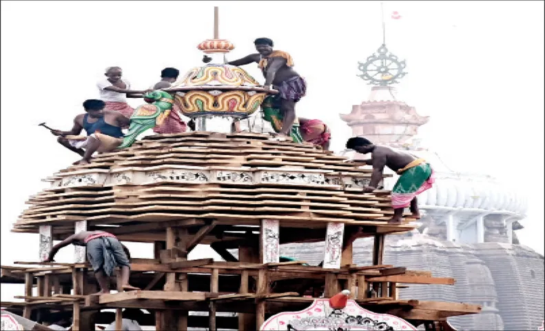 ରଥ ନିର୍ମାଣ କାର୍ଯ୍ୟ ୫୩ ଦିନରେ ପହଞ୍ଚିଛି। ଆଜି ତିନିରଥରେ ଭୋଇ ସେବକମାନେ ମିଶି ତିନି ରଥର ଦୁଇଟି ଲେଖାଏଁ ପାର୍ଶ୍ୱ ଦୁଆର ବେଢ଼ାକୁ ବାଉଁଶ ତେଣ୍ଟିଆ ସହାୟତାରେ ଉଠାଇ ନାଟ ଗୋଡ଼ ସହ ସଂଯୋଗ କରିଛନ୍ତି। ତିନିରଥର ଦୁଆର ବେଢ଼ାକୁ ମଜବୁତ୍ ରଖିବା ପାଇଁ ଦୁଆର ବେଢ଼ାଗୁଡ଼ିକର ଉପର ଭାଗ ଚନ୍ଦ୍ରଶାଳୀରେ ଧ୍ୱଜ ବତା ସଂଯୋଗ କରାଯାଇଛି। ମଝି ଭୂଇଁ ଶେଣିରେ କଣ୍ଟା ବସି ସେଟିଂ କରାଯାଇଛି। ଏଥିସହ ତିନି ରଥର ଦୁଆର ବେଢ଼ାକୁ ବାନ୍ଧି ରଖିବା ପାଇଁ ପ୍ରତି ଦୁଆର ବେଢ଼ାର ନାଟ ଗୋଡ଼ ସହ ଚଉଦ ନାହାକାରେ ଦୁଇଟି ଲେଖାଏଁ ସପୋର୍ଟ ବଟନ୍ ବା ଦୁଆର ବାଣିଆ ପ୍ରତି ରଥରେ ୧୬ଟି ଲେଖାଏଁ ଖଞ୍ଜାଯାଇଛି। ମହାରଣା ସେବକମାନେ ତିନି ରଥ ଭୋଇ ସେବକଙ୍କ ସହଯୋଗରେ ତିନି ରଥର ପ୍ରତି କୋଣଗୁଡ଼ିକରେ ଦୁଇଟି ଲେଖାଏଁ କଣି ଫାଉଡ଼ି ବସାଇଛନ୍ତି। ତିନିରଥ ଚାରି ପାର୍ଶ୍ବରେ ଦୁଇଟି ଲେଖାଏଁ ମଣ୍ଡଣୀବତା ପଡ଼ି ବଡ଼ଥଳ ପୋଟଳଠାରୁ ଚନ୍ଦ୍ର ଶାଳୀ ପର୍ଯ୍ୟନ୍ତ ଲାଗିଛି। ଆସନ୍ତାକାଲି ‘ହାତିଆଳ ମାଳ’ ବା କାଠ ବଟନ୍ ଆଠଟି ଲେଖାଏଁ ବଡ଼ ଥଳ ପୋଟଳ ଠାରୁ ଦୁଆର ବେଢ଼ା ପର୍ଯ୍ୟନ୍ତ ଖଞ୍ଜା ଯିବ। ଫଳରେ ରଥରେ କନା ପଡ଼ିବା ସୁବିଧା ଜନକ ହେବା ସହ ରଥର କନା ଆବରଣ ଏକ ଗୋଲାକାର ଆକୃତି ଦୃଶ୍ୟମାନ ହେବ। ଏଥିରେ ରଥର ଗଠନ ଶୈଳୀ ସୁନ୍ଦର ଦେଖାଯିବା ସହ ରଥ କନା ସୁରକ୍ଷିତ ରହିବ।