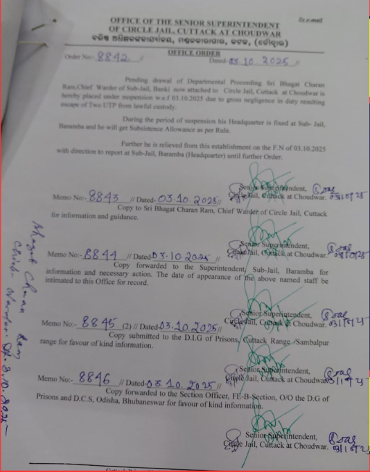 ଚୌଦ୍ଵାର ଜେଲରୁ କଏଦୀ ଚମ୍ପଟ ମାରିବା ଘଟଣାରେ ଚାଞ୍ଚଲ୍ୟକର ତଥ୍ୟ ସାମ୍ନାକୁ ଆସିଛି। ଜେଲ ବିଭାଗର କଳା କାରନାମା ଉପରୁ ପରଦା ହଟାଇଛି ଏହି ଘଟଣା। କାର୍ଯ୍ୟରେ ଅବହେଳା କରିଥିବା କର୍ମଚାରୀଙ୍କୁ ଜେଲ ବିଭାଗ କିପରି ଅହେତୁକ ଅନୁକମ୍ପା ଦେଖାଇଛି ତାହା ସାମ୍ନାକୁ ଆସିଛି। ସୂଚନା ଅନୁସାରେ, ଚୌଦ୍ଵାର ଜେଲରୁ ୨ କଏଦୀ ଚମ୍ପଟ ମାରିବା ଘଟଣାରେ କାର୍ଯ୍ୟରେ ଅବହେଳା ପାଇଁ ମୁଖ୍ୟ ଓ୍ବାର୍ଡର ଭଗତ ଚରଣ ରାମଙ୍କୁ ଗତ ଅକ୍ଟୋବର ୩ ତାରିଖରେ ନିଲମ୍ବନ କରାଯାଇଥିଲା। କିନ୍ତୁ ଏହାର ମାତ୍ର ୧୫ ଦିନ ପରେ ଅକ୍ଟୋବର ୧୮ରେ ତାଙ୍କୁ କେନ୍ଦ୍ରାପଡ଼ା ଜେଲରେ ପୁନଃନିଯୁକ୍ତି ମିଳିଛି। ଯାହାଫଳରେ ବିଭାଗର ଏହି କାର୍ଯ୍ୟାନୁଷ୍ଠାନକୁ ନେଇ ପ୍ରଶ୍ନ ଉଠିଛି।