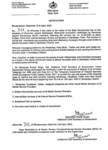 ହନୁମାନ ଜୟନ୍ତୀ ପୂର୍ବରୁ ସମ୍ବଲପୁରରେ ଜାରି ହୋଇଛି ୧୪୪ ଧାରା । ୪୮ ଘଣ୍ଟା ପାଇଁ ଇଣ୍ଟରନେଟ୍ ସେବା ବନ୍ଦ କରାଯାଇଛି ।ଇଣ୍ଟରନେଟ୍ ସେବର ବନ୍ଦ ନେଇ ରାଜ୍ୟ ସରକାରଙ୍କ ଗୃହ ବିଭାଗ ପକ୍ଷରୁ ବିଜ୍ଞପ୍ତି ଜାରି କରାଯାଇଛି |ଆସନ୍ତାକାଲି ହନୁମାନ ଜୟନ୍ତୀ ଥିବାରୁ କୌଣସି ବିଶୃଙ୍ଖଳା ପରିସ୍ଥତି ନ ଘଟିବା ପାଇଁ ପ୍ରାଶସନ ପକ୍ଷରୁ ଏହି ପଦକ୍ଷେପ ଗ୍ରହଣ କରାଯାଇଛି। ସୂଚନା ଅନୁସାରେ, ଗତକାଲି ସମ୍ବଲପୁରରେ ହନୁମାନ ଜୟନ୍ତୀ ପାଇଁ ବାଇକ ରାଲି ଶୋଭାଯାତ୍ରା ବେଳେ ଉତ୍ତେଜନା ପ୍ରକାଶ ପାଇଥିଲା। ଧନୁପାଲି ଛକରୁ ରାଲି ଗଲା ବେଳେ ଦୁଇଗୋଷ୍ଠୀ ଭିତରେ ଗଣ୍ଡଗୋଳ ହୋଇଥିଲା। ଏହାକୁ ଅଟକାଇବାକୁ ଚେଷ୍ଟା କରିବା ବେଳେ ପୋଲିସ ଉପରେ ଉତ୍ତ୍ୟକ୍ତ ଲୋକମାନେ ପଥର ମାଡ଼ କରିଥିଲେ। ଏହାସହ ଉତ୍ତ୍ୟକ୍ତ ଲୋକେ ଦୋକାନ ଜାଳିବା ସହ କାର୍, ବାଇକ ଜାଳି ଦେଇଥିଲେ।